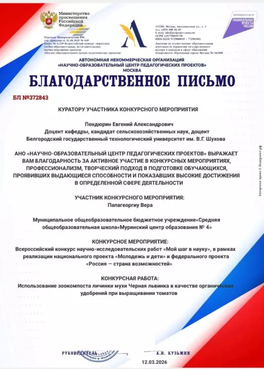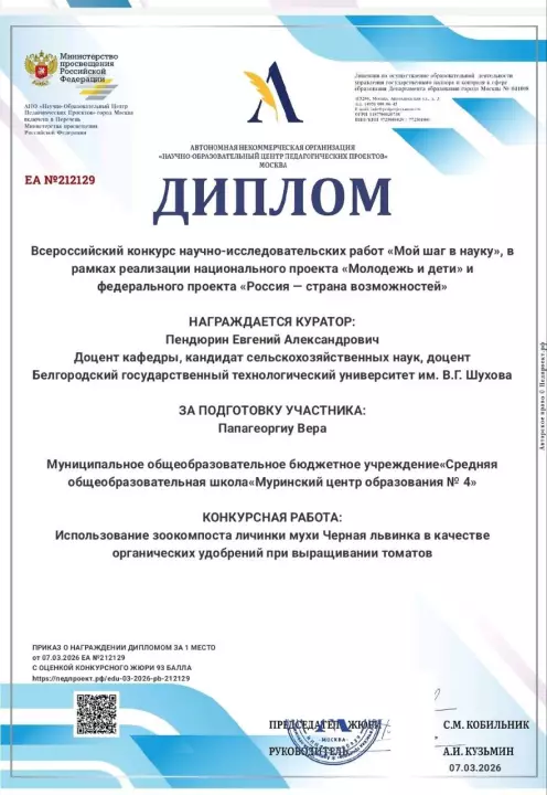 Работа получила высокую оценку экспертов за актуальность и практическую значимость в сфере экологии и сельского хозяйства. Гордимся нашими наставниками!