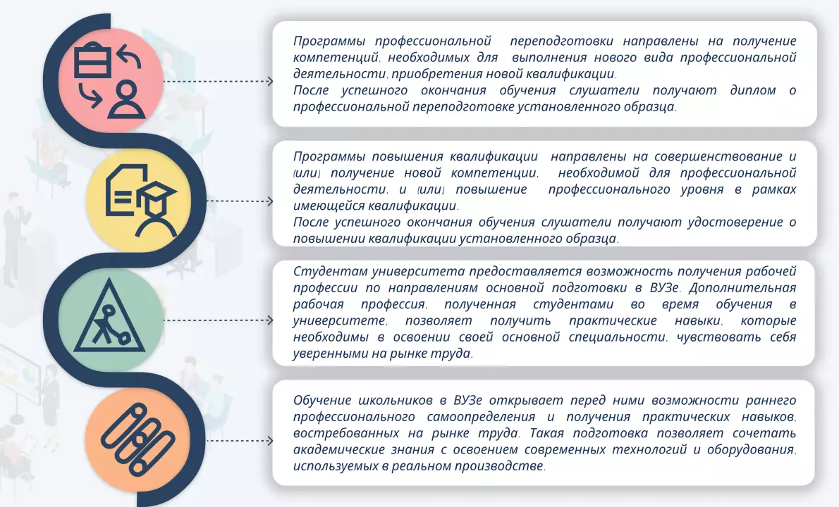 Дополнительное профессиональное образование - это одна из форм последипломного образования и адресовано оно тем, кто уже имеет первое базовое среднее или высшее профессиональное образование, и представляет собой организованный и устойчивый процесс получения новых знаний, навыков и умений, позволяющий максимально реализовать и развить себя, самоопределиться предметно, социально, профессионально, личностно.