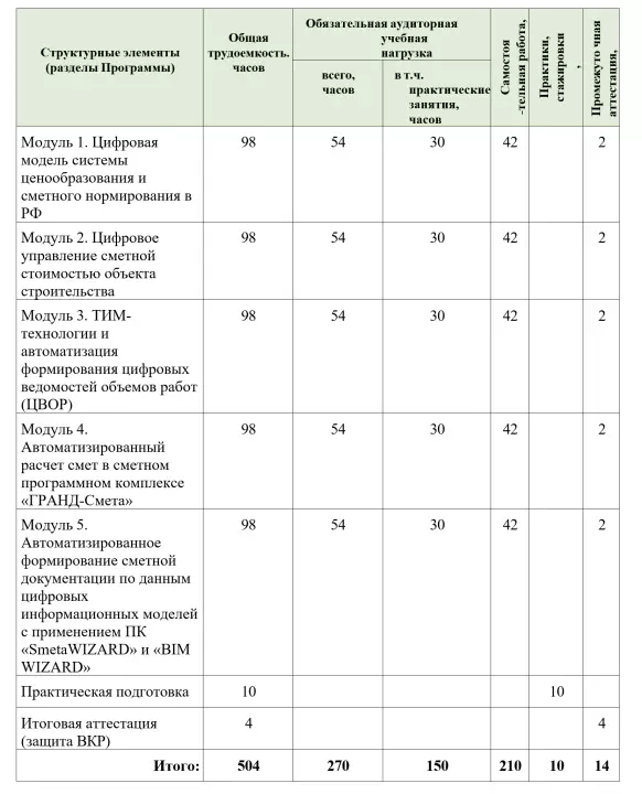 Модули программы: цифровая модель системы ценообразования и сметного нормирования в РФ; цифровое управление сметной стоимостью объекта строительства; ТИМ-технологии и автоматизация формирования цифровых ведомостей объемов работ: анализ данных в сметном деле; автоматизация составления сметной документации; параметрическое моделирование в среде визуального программирования; автоматизированный расчет смет в сметном программном комплексе «ГРАНД-Смета», ПК «SmetaWIZARD» и «BIM WIZARD».