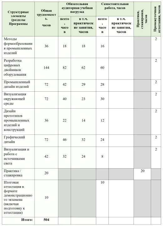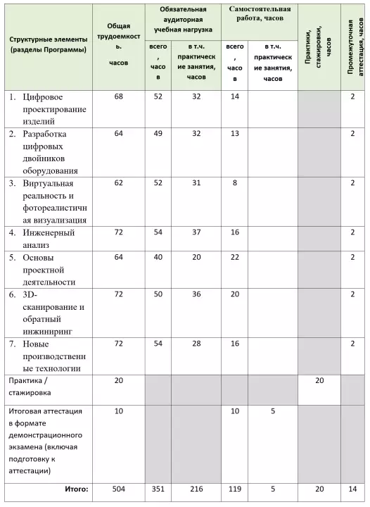 Модули программы: цифровое проектирование изделий и разработка цифровых двойников оборудования; виртуальная реальность и фотореалистичная визуализация; инженерный анализ; основы проектной деятельности; 3D-сканирование и обратный инжиниринг; новые производственные технологии.