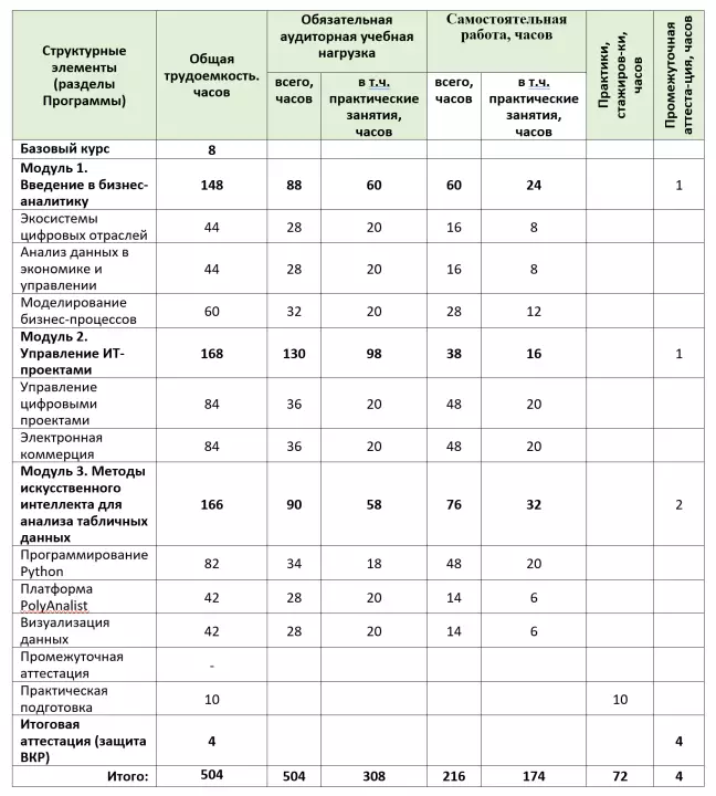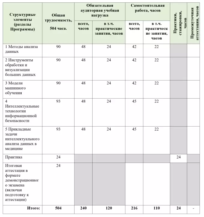 Модули программы: обработка и визуализация больших данных; анализ больших данных; задачи кластеризации и классификации; облачные сервисы и технологии; машинное обучение; искусственные нейронные сети; модели анализа и прогнозирования процессов на основе больших данных.