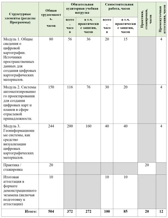 Модули программы: источники исходных данных для создания цифровых картографических материалов; системы автоматизированного проектирования для создания цифровых карт и планов в сфере отраслевой принадлежности; геоинформационные системы, как средство визуализации цифровых картографических материалов.