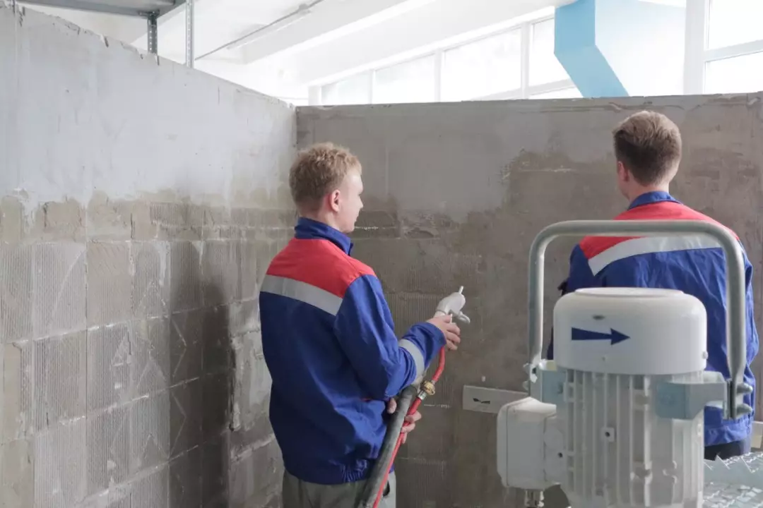В рамках практической подготовки, которая проходит в мастерских Белгородского строительного колледжа, студенты обучаются приёмам оштукатуривания поверхностей стен и перегородок зданий штукатурными растворами.