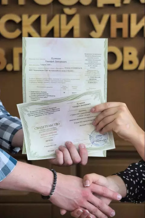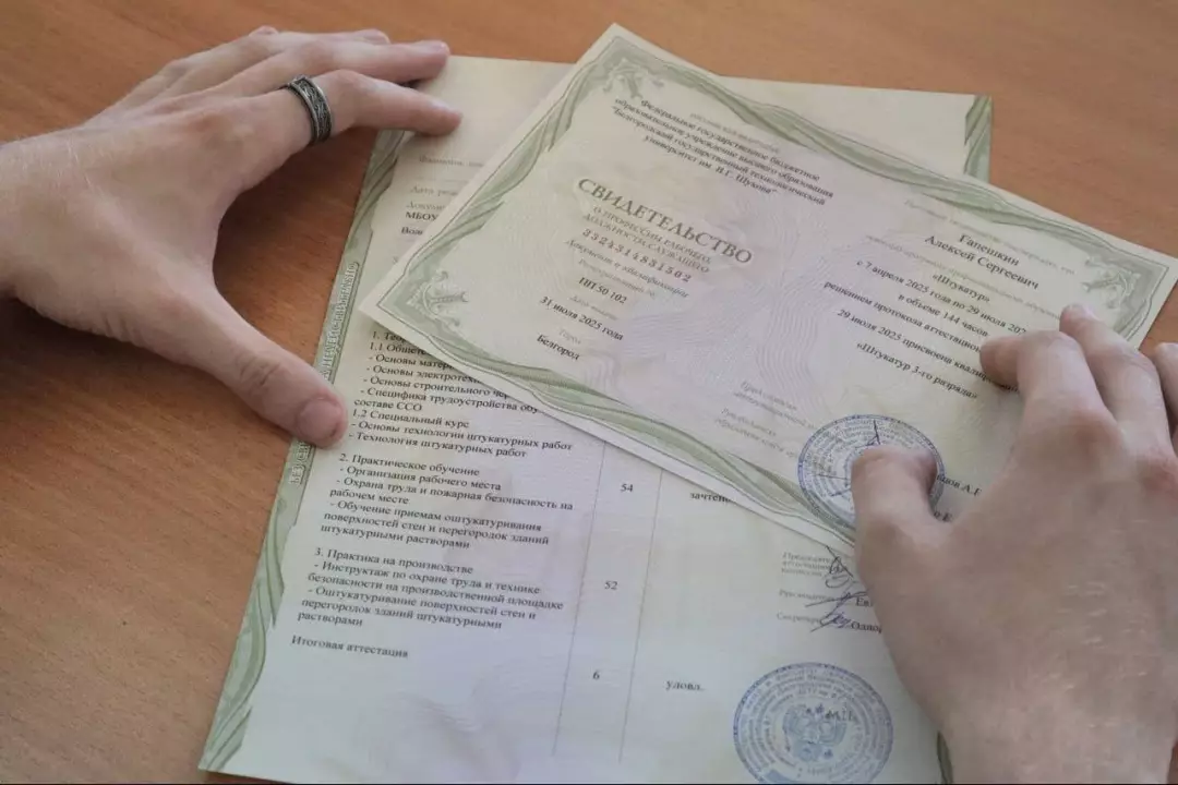 Сегодня, 31 июля, в институте дополнительного образования состоялось вручение документов об образовании – свидетельств о профессии рабочего, по профессиональному обучению участников Российских студенческих отрядов по рабочим профессиям: «11196 Бетонщик», 3-го разряда; «19727 Штукатур», 3-го разряда; «13450 Маляр строительный», 3 разряд; «12680 Каменщик», 3 разряд.