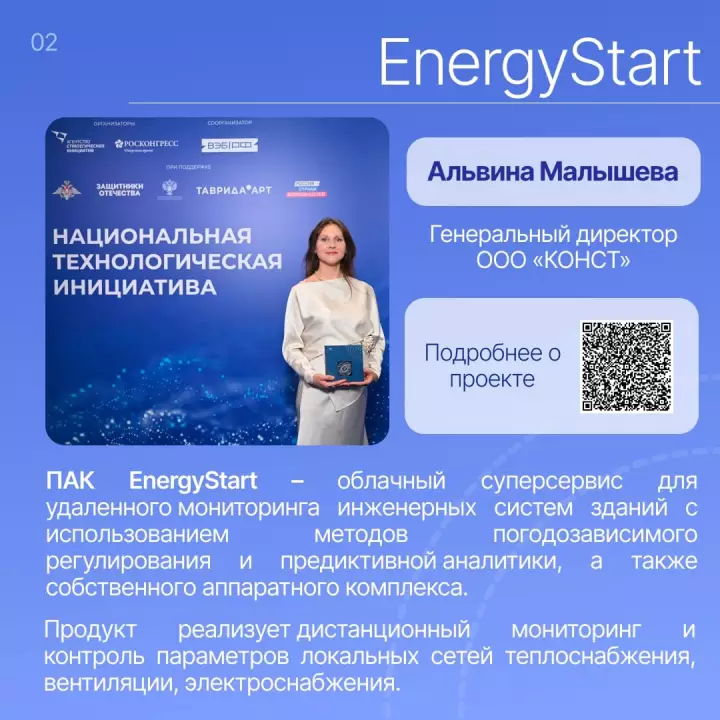 Ассистент кафедры электроэнергетики и автоматики, генеральный директор ООО «Конст» Альвина Малышева отмечена в номинации «Национальная технологическая инициатива». Она представила программно-аппаратный комплекс EnergyStart.