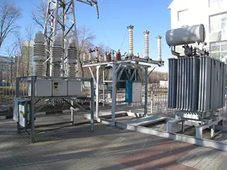 ОРУ 35 кВ связано с понижающим силовым трансформатором FTDO 1250/35 проводом АС-50/8. Мощность трансформатора – 1250 кВА, год выпуска 1961, производства ГДР. Трансформатор понижает напряжение от уровня 35 кВ до уровня 10 кВ. Трансформатор установлен на металлической раме, соединенной с ОРУ. Система охлаждения трансформатора: масляное естественное охлаждение. Внешний вид трансформатора представлен на фото 3.