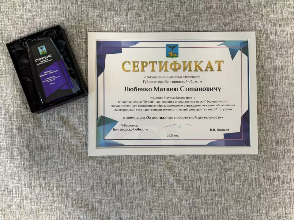 Одним из 55 награжденных был студент третьего курса бакалавриата института экономики и менеджмента, направления «Публичная политика и социальные науки», Матвей Любенко, который, показав отличные достижения в спорте, получил сертификат о назначении именной стипендии Губернатора Белгородской области в номинации «За достижения в спортивной деятельности».