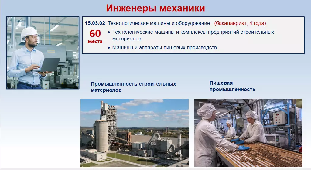 Обучение специализируется на подборе технологических машин и оборудования, организации их монтажа, наладки, обслуживания, ремонта и модернизации. Свою деятельность осуществляет на предприятиях промышленности по производству строительных материалов, изделий и конструкций, горнорудной промышленности, пищевой и перерабатывающей промышленности, на машиностроительных предприятиях.