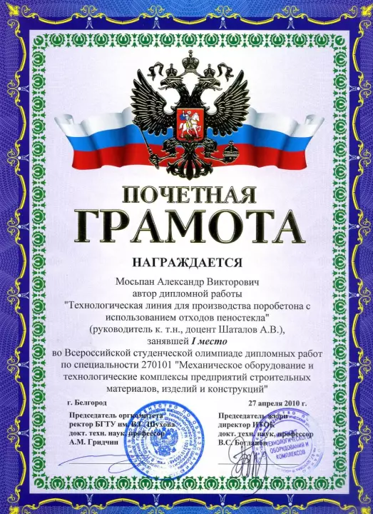 Аспирант секции НСМ, Мосьпан Александр, стал победителем Всероссийской олимпиады дипломных работ по специальности 270101 "Механическое оборудование и технологические комплексы предприятий строительных материалов, изделий и конструкций".