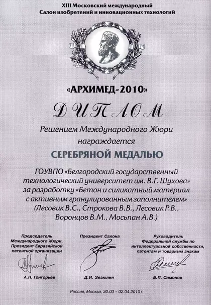 Решением жюри XIII Московского международного Салона изобретений и инновационных технологий "Архимед-2010" коллектив в составе Лесовика В.С., Строковой В.В., Лесовика Р.В., Воронцова В.М., Мосьпана А.В., награждён серебрянной медалью.