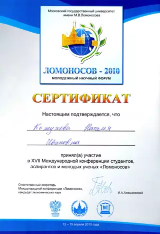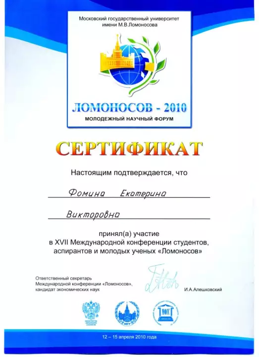 15 апреля 2010 г. Международная научная конференция студентов, аспирантов и молодых ученых «Ломоносов-2010».