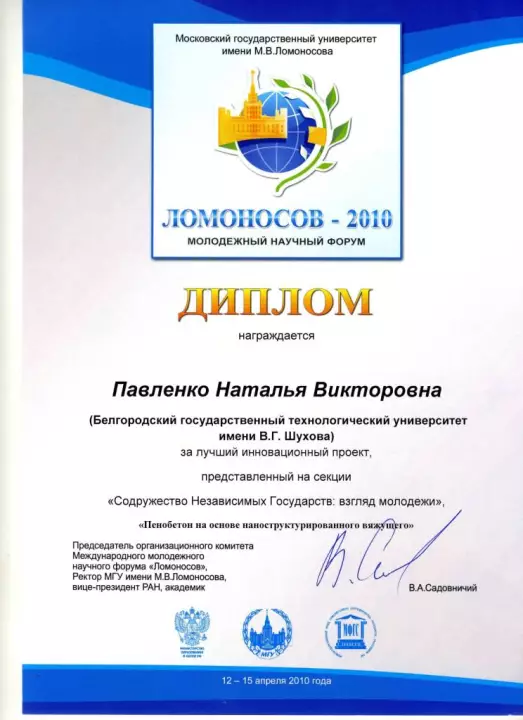 Павленко Наталья Викторовна награждена дипломом за лучший инновационный проект, представленный на секции «Содружество Независимых Государств: взгляд молодёжи»