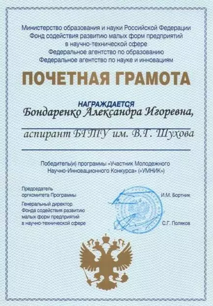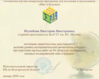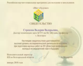 Были награждены свидетельствами за высокий уровень исследовательской деятельности молодежи при подготовке научных работ на XIV областную конференцию молодых исследователей «Шаг в будущее», Нелюбова Виктория Викторовна ст. преподаватель, Строкова Валерия Валерьевна д.т.н., профессор БГТУ им. В.Г.Шухова.