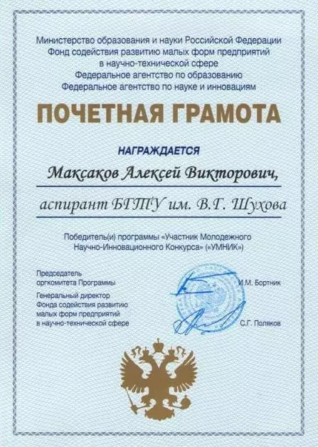 Поздравляем аспиранта секции НСМ, Максакова Алексея, занявшего I место во втором (региональном) туре Всероссийского конкурса выпускных аттестационных работ.