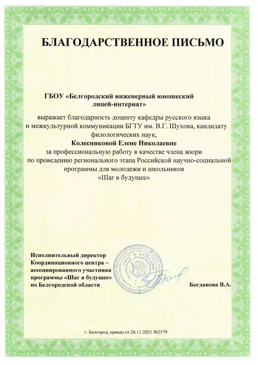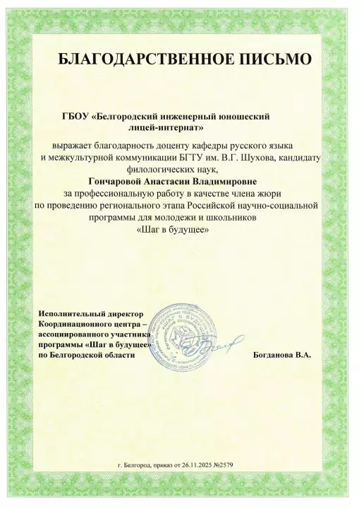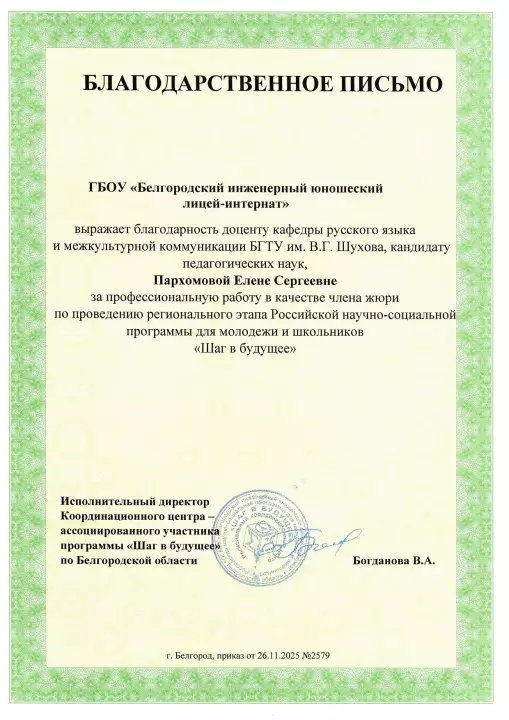 Кафедра русского языка и межкультурной коммуникации БГТУ имени В.Г. Шухова принимает активное участие в работе с одарёнными детьми и молодёжью. Зав.кафедрой Анастасия Владимировна Гончарова, а также доценты кафедры Колесникова Елена Николаевна и Пархомова Елена Сергеевна получили благодарность от координационного центра-ассоциированного участника научно-социальной программы для молодёжи и школьников «Шаг в будущее» за плодотворную работу в составе жюри регионального этапа. Для преподавателей всегда очень ответственно и волнительно быть в качестве судей мероприятия такого уровня. Пожелаем им успеха в дальнейшей работе!