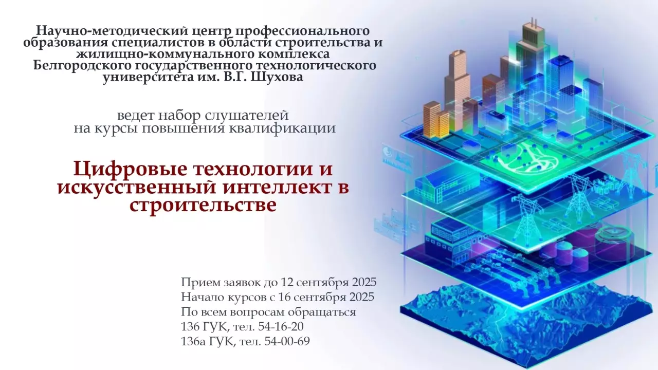 Научно-методический центр строительства и ЖКХ кафедры строительства и городского хозяйства БГТУ им. В.Г. Шухова ведет набор слушателей на курсы повышения квалификации «Цифровые технологии и искусственный интеллект в строительстве»