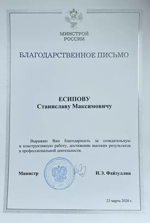 Мы рады поделиться важной новостью: заместитель заведующего кафедрой, кандидат технических наук, доцент Есипов Станислав Максимович отмечен благодарностью Министерства строительства и жилищно-коммунального хозяйства РФ.
