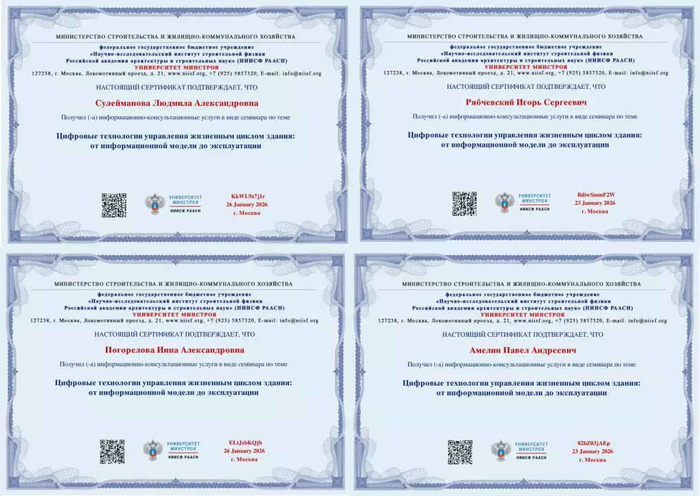 Преподаватели кафедры строительства и городского хозяйства БГТУ им. В.Г. Шухова: заведующий кафедрой, д-р техн. наук, профессор Сулейманова Л.А., канд. техн. наук, доцент Погорелова И.А., канд. техн. наук, ст. преп. Рябчевский И.С., канд. техн. наук, ст. преп. Амелин П.А.; освоили курс «Цифровые технологии управления жизненным циклом здания: от информационной модели до эксплуатации» от Университета Минстроя НИИСФ РААСН.