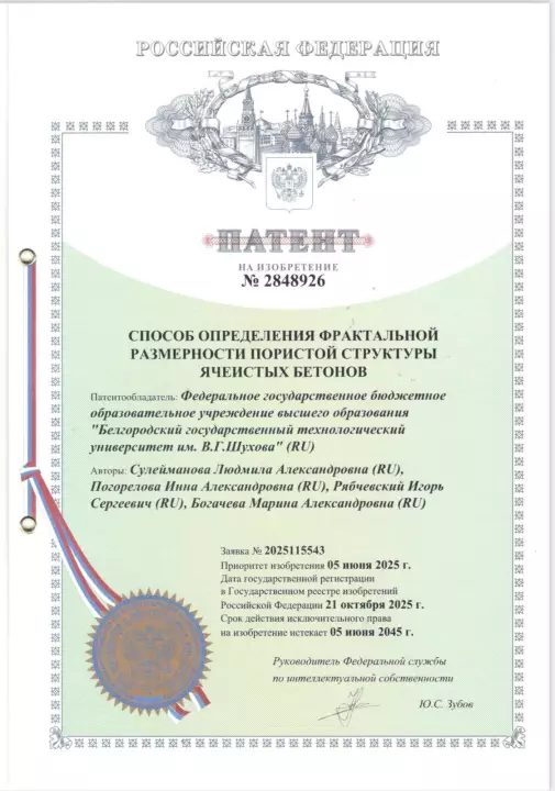 Делимся с вами успешным результатом научно-исследовательской и изобретательской деятельности ученых кафедры строительства и городского хозяйства БГТУ им. В.Г. Шухова д-ра техн. наук, профессора Сулеймановой Людмилы Александровны, канд. техн. наук, доцента Погореловой Инны Александровны, канд. техн. наук, старшего преподавателя Рябчевского Игоря Сергеевича, старшего преподавателя Богачевой Марины Александровны - Способ определения фрактальной размерности пористой структуры ячеистых бетонов.