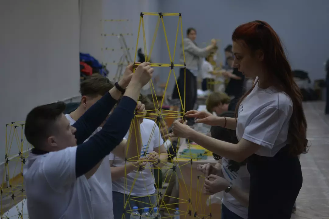 Наша команда «Шуховцы», Иван Пахомов, Вероника Смулярова, Анастасия Сураева, Максим Пикин, Иван Куликов, сконструировала необычную башню, которая выдержала проверку временем, но по высоте уступила соперникам.