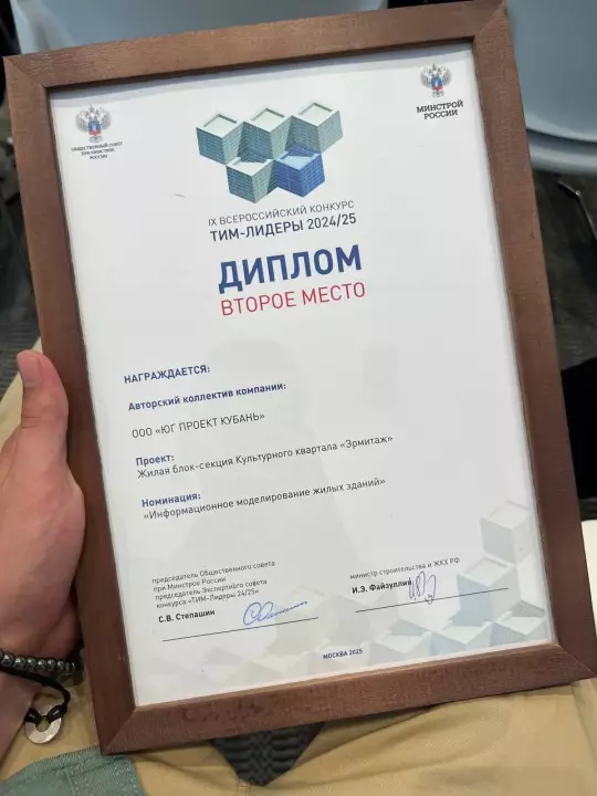 В Минстрое России прошло торжественное награждение, где команда компании «ЮгПроектКубань» заняла 2-е место в номинации «Информационное моделирование жилых зданий»!