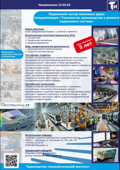 23.05.03 - Подвижной состав железных дорог (специализация - «Технология производства и ремонт подвижного состава»), форма обучения - очная (5 лет) и заочная (6 лет), квалификация - инженер путей сообщения.
