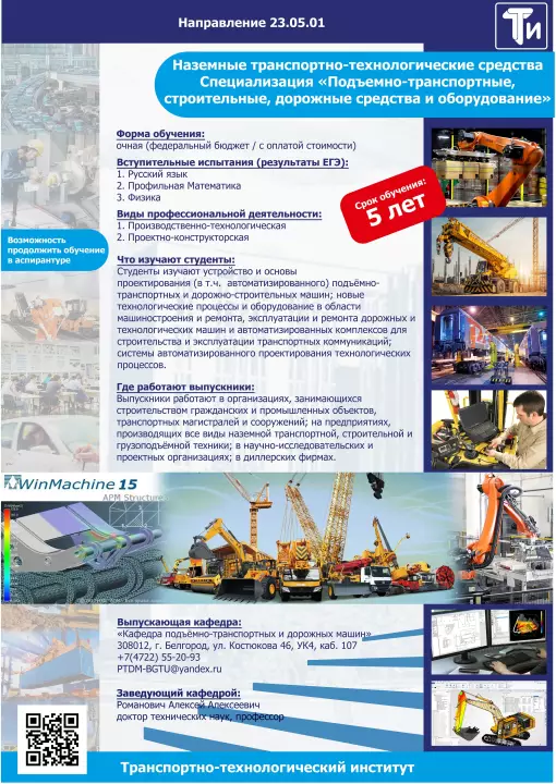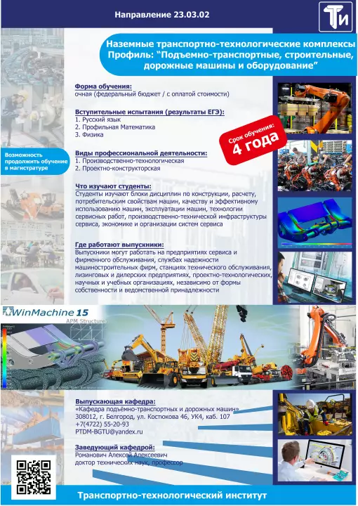23.03.02 - Наземные транспортно-технологические комплексы (профиль - «Подъемно-транспортные, строительные, дорожные машины и оборудование»), форма обучения - очная (4 года) и заочная (5 лет), квалификация - бакалавр.