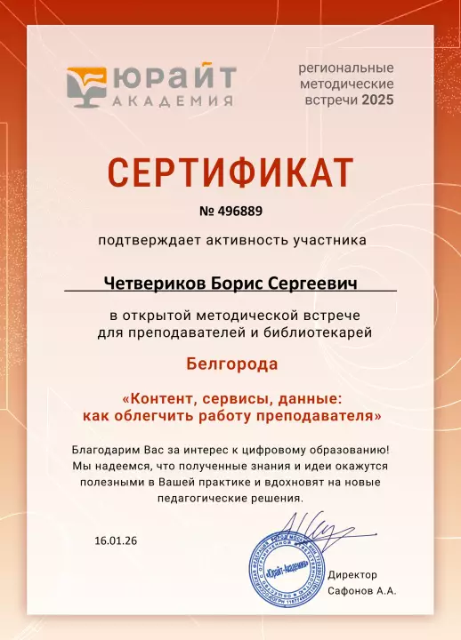 По итогам мероприятия Четвериков Борис Сергеевич получил официальный сертификат участника от «Юрайт-Академии» за активное участие в открытой методической встрече в Белгороде на тему: «Контент, сервисы, данные: как облегчить работу преподавателя».