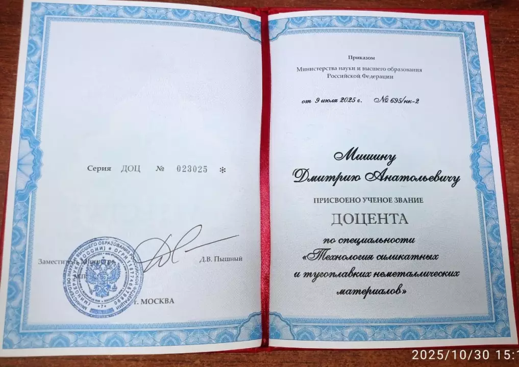 На заседании Учёного совета БГТУ им. В. Г. Шухова заведующему кафедрой Технологии цемента и композиционных материалов, кандидату технических наук Дмитрию Анатольевичу Мишину вручён диплом о присвоении учёного звания доцента по специальности «Технология силикатных и тугоплавких неметаллических материалов