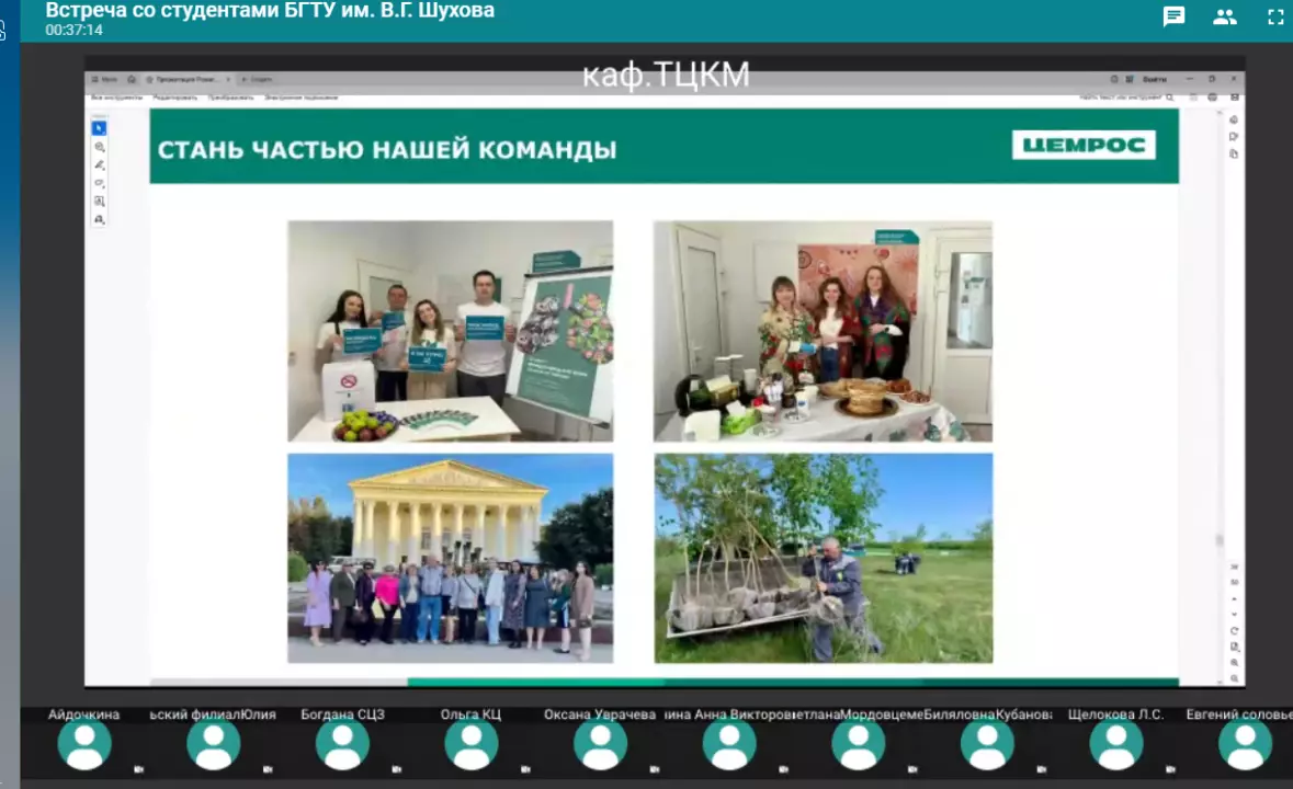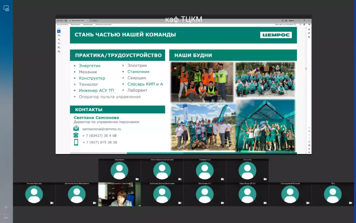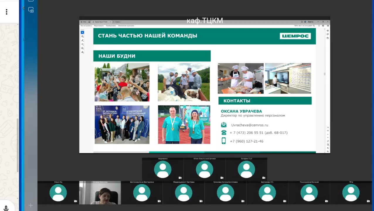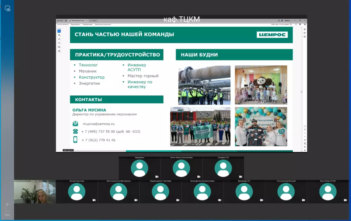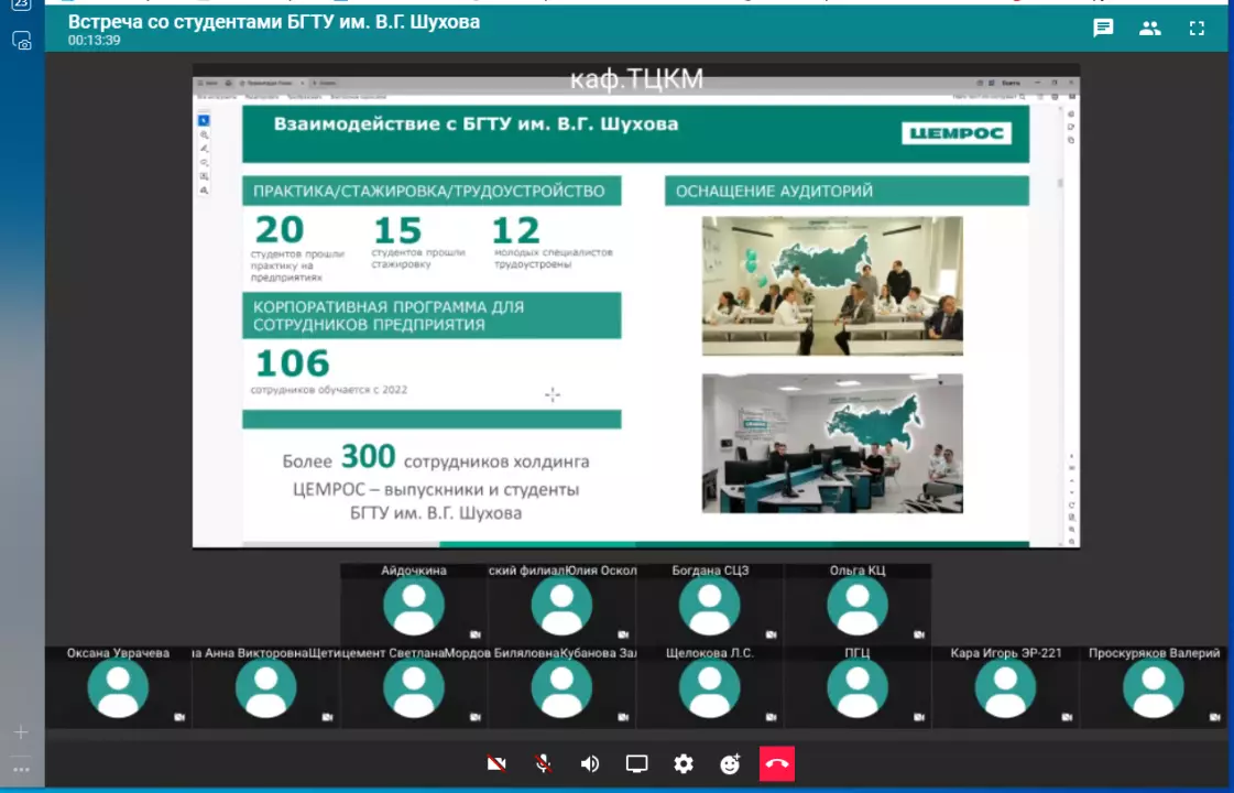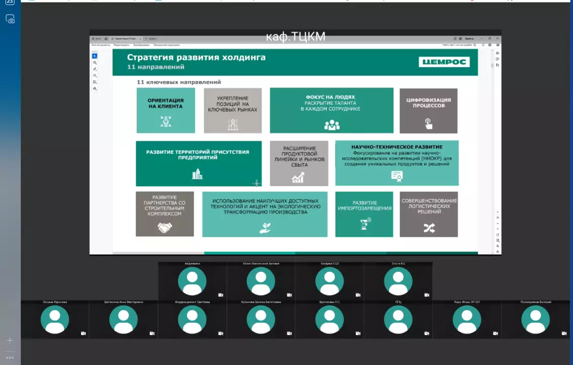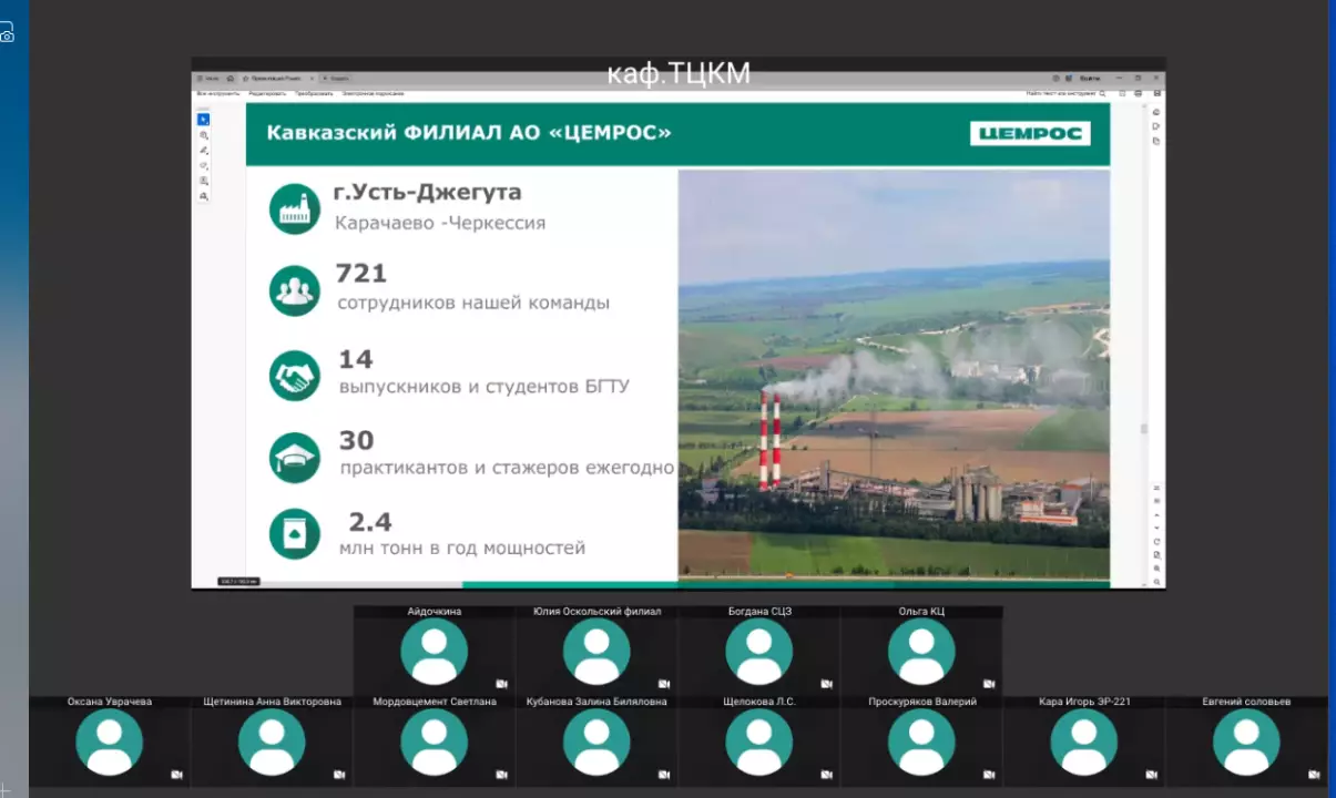 На кафедре Технологии цемента и композиционных материалов в очно-дистанционном формате состоялась встреча студентов и магистрантов с представителями холдинга ЦЕМРОС, который является стратегическим партнером университета.