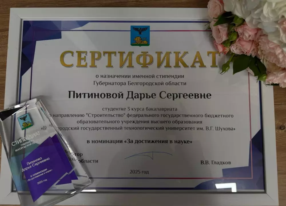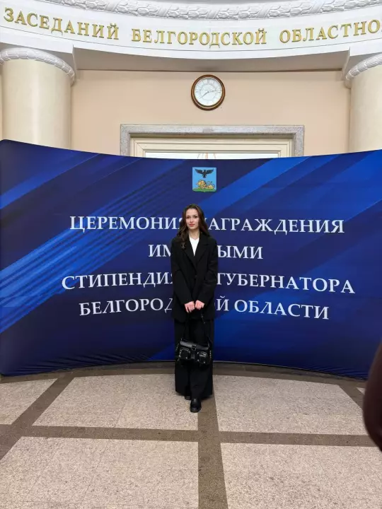 Студентка группы ТВ-231 Питинова Дарья удостоена именной стипендии Губернатора Белгородской области в номинации «За достижения в науке».