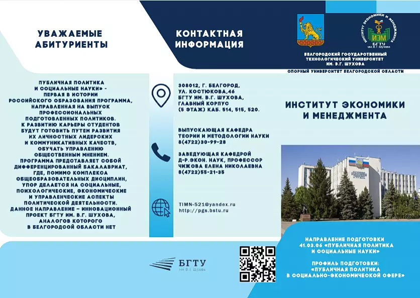 Программа представляет собой дифференцированный бакалавриат, где, помимо комплекса общеобразовательных дисциплин, упор делается на социальные, психологические, экономические и управленческие аспекты политической деятельности. Данное направление – инновационный проект БГТУ им. В.Г. Шухова, аналогов которого в Белгородской области нет.