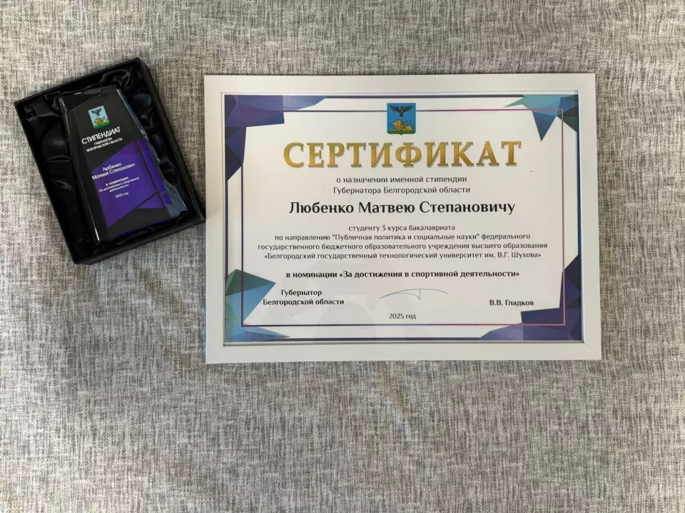 1 декабря состоялась торжественная церемония награждения белгородских студентов именными стипендиями. Одним из 55 награжденных был студент третьего курса бакалавриата Института экономики и менеджмента, направления «Публичная политика и социальные науки», Матвей Любенко, который, показав отличные достижения в спорте, получил сертификат о назначении именной стипендии Губернатора Белгородской области в номинации «За достижения в спортивной деятельности».