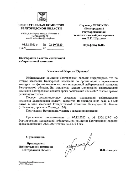По итогам конкурса Дорофеев Кирилл Юрьевич был назначен членом молодежной избирательной комиссии Белгородской области срока полномочий 2025 – 2027 годов с правом решающего голоса!
