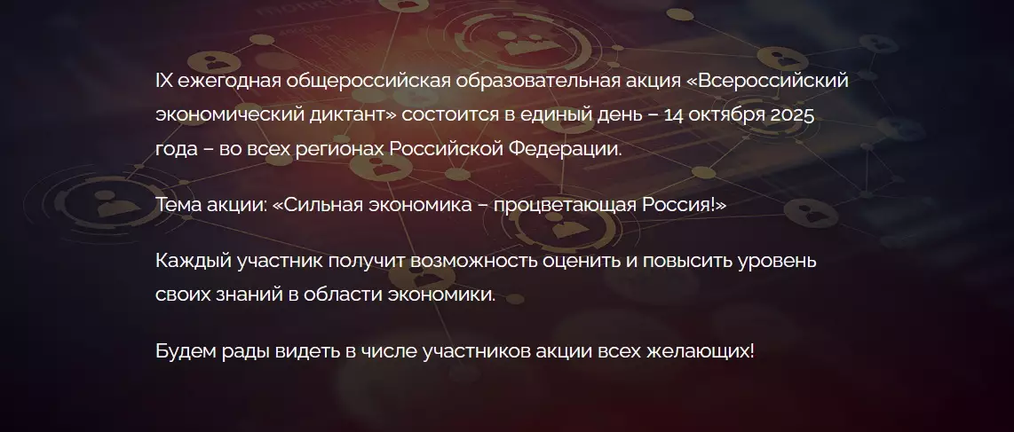 14 октября 2025 г. во всех регионах России пройдет общероссийская образовательная акция «Всероссийский экономический диктант».