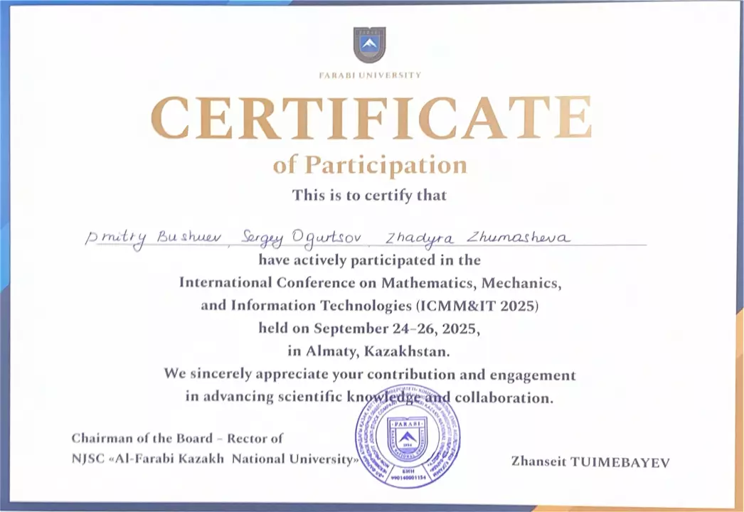 Заведующий кафедрой ТК Бушуев Дмитрий Александрович и аспирант Огурцов Сергей приняли участие в X Международной конференции по «Математике, механике и информационным технологиям», которая проходила в Казахском национальном университете им. Аль-Фараби.