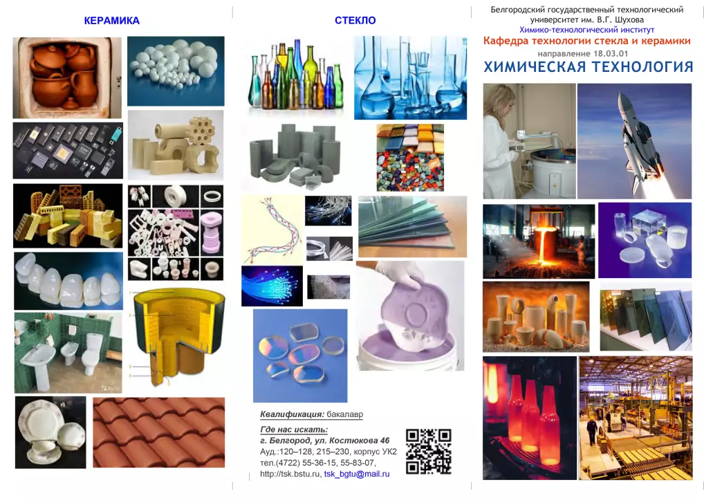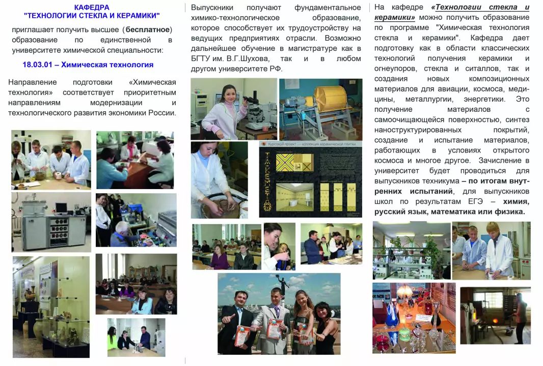 На кафедре «Технологии стекла и керамики» можно получить образование по программе "Химическая технология стекла и керамики". Кафедра дает подготовку как в области классических технологий получения керамики и огнеупоров, стекла и ситаллов, так и создания новых композиционных материалов для авиации, космоса, медицины, металлургии, энергетики. Это получение материалов с самоочищающейся поверхностью, синтез наноструктурированных покрытий, создание и испытание материалов, работающих в условиях открытого космоса и многое другое. Зачисление в университет будет проводиться для выпускников техникума – по итогам внутренних испытаний, для выпускников школ по результатам ЕГЭ – химия, русский язык, математика или физика.