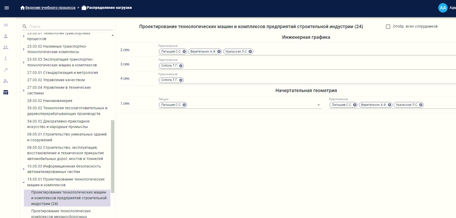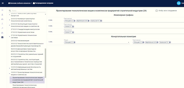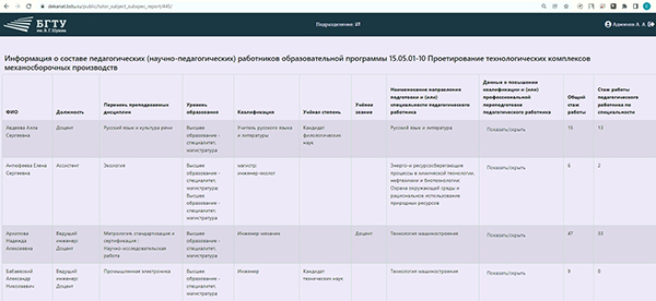 По каждой кафедре ответственные сотрудники проделали работу по закреплению в Модуле за каждой дисциплиной ведущих преподавателей. Список учебных дисциплин и формы проведения занятий автоматически загружаются в Модуль согласно рабочим программам из подсистемы «Планирование», являющейся составной частью «Открытого цифрового университета». Необходимые сведения о преподавателях (занимаемая должность, уровень образования, квалификация, наименование направления подготовки и (или) специальности, ученая степень (при наличии), ученое звание (при наличии), повышение квалификации и (или) профессиональная переподготовка (при наличии), общий стаж работы, стаж работы по специальности) импортируются из кадровой системы «АЦК: Комплексный учет», тем самым используются данные без повторного внесения в Модуль.