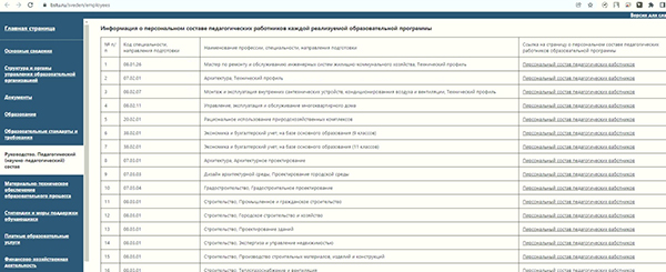 На основе заполненных в Модуле данных были сгенерированы страницы сайта, содержащие специальную html-разметку, позволяющую однозначно идентифицировать информацию о составе персональных работников по каждой реализуемой образовательной программе в соответствии с требованиями Приказа Рособрнадзора №831. Ознакомиться со списком сгенерированных страниц можно по ссылке https://bstu.ru/sveden/employees.
