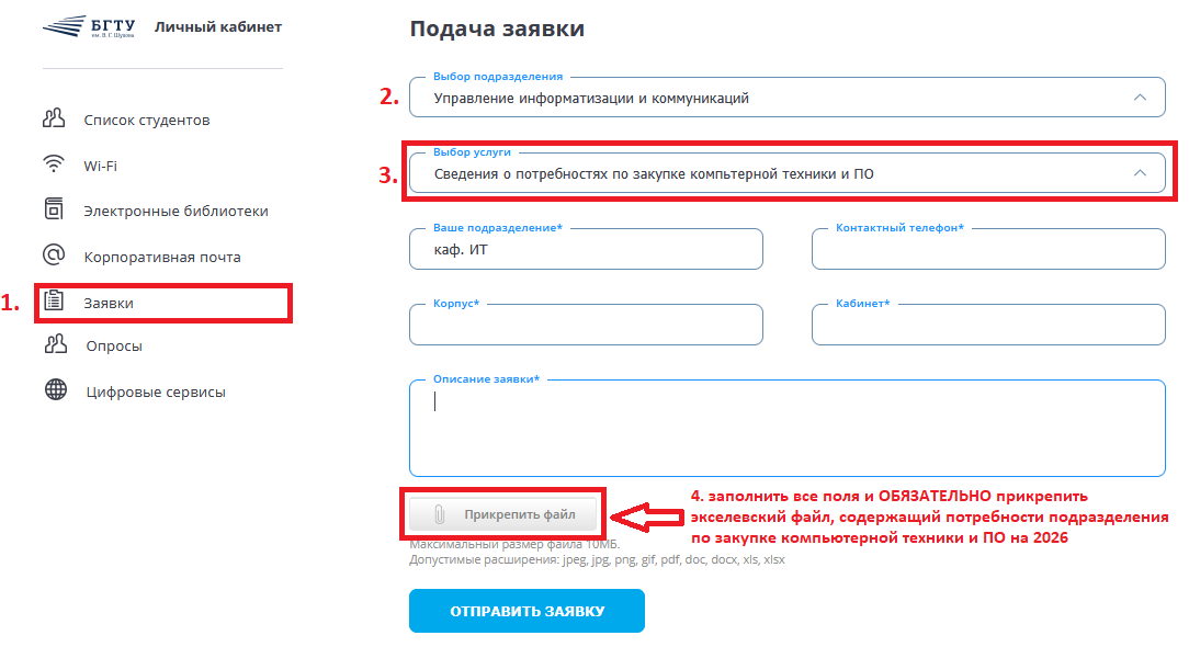 - заполнить все поля и ОБЯЗАТЕЛЬНО прикрепить экселевский файл, содержащий потребности подразделения по закупке компьютерной техники и ПО на 2026