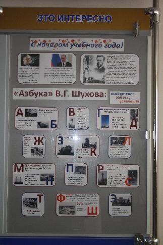 В научно- технической библиотеке оформлен стенд, посвященный изобретениям и увлечениям В.Г. Шухова на все буквы алфавита. Например: А-авиационные ангары; Б-баржи нефтеналивные; В-воздушно-канатные дороги; Г-газгольдеры (газохранилища) Д – доменные печи и т.д.