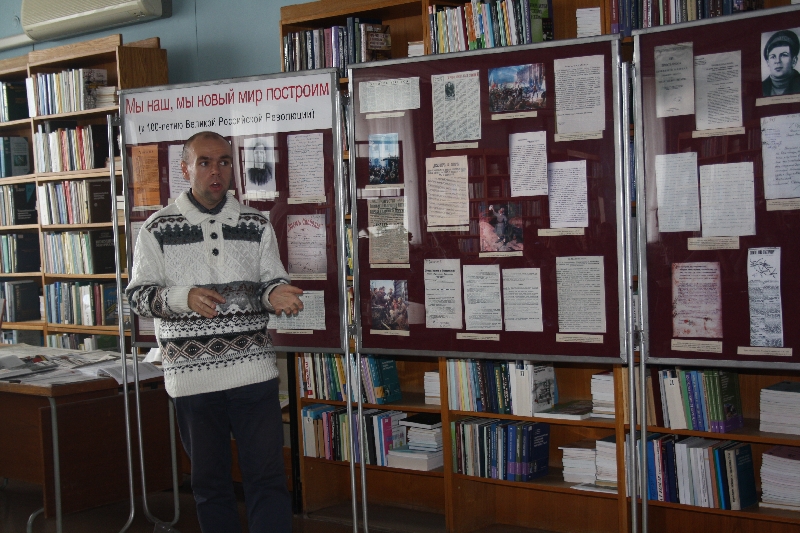 Сегодня в научно-технической библиотеке состоялась презентация выставки «Мы наш, мы новый мир построим», посвященная 100-летию революции 1917 года в России. Студенты групп ЭК – 11, ЭК -12 с большим интересом слушали выступление директора Государственного архива Белгородской области Павла Юрьевича Субботина о том, что происходило сто лет назад на Белгородчине.