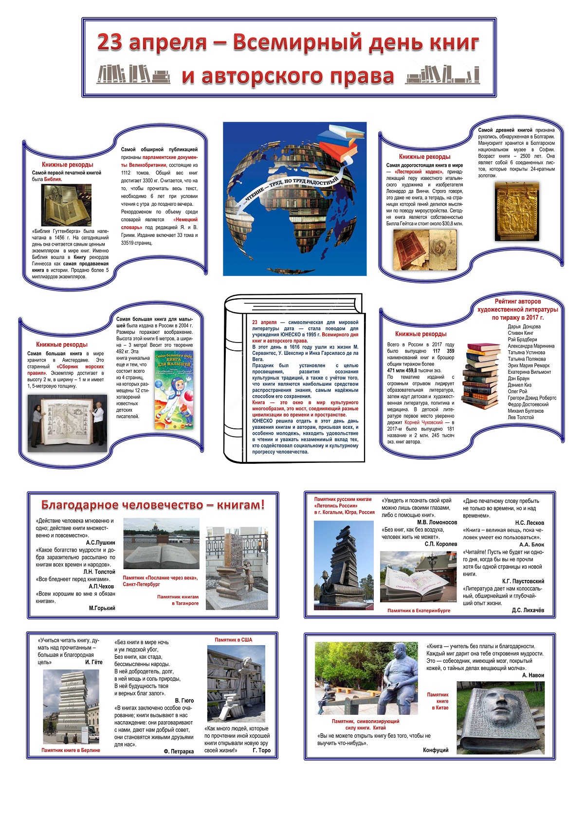 С целью просвещения, развития осознания культурных традиций, а также с учётом того, что книги являются наибольшим средством распространения знания, самым надёжным способом его сохранения в 1995г. ЮНЕСКО был установлен праздник - Всемирный день книг и авторского права. Он отмечается ежегодно 23 апреля.