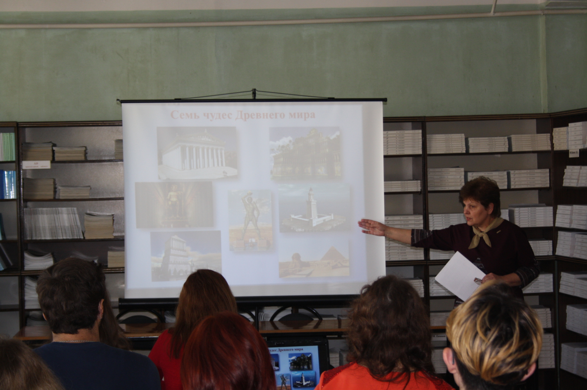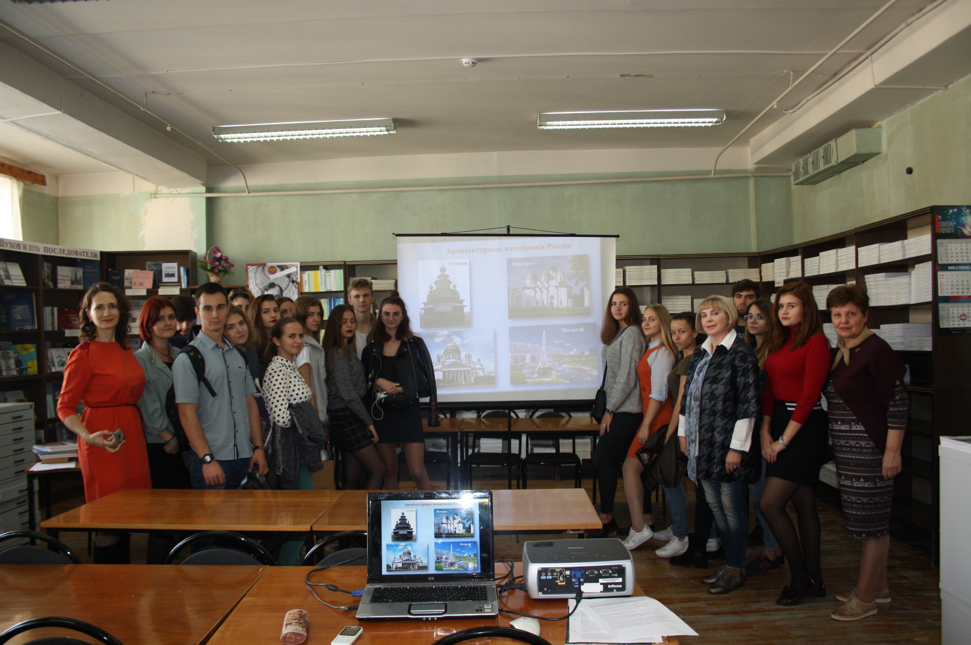 17 октября в научно-технической библиотеке состоялось комплексное мероприятие «Шедевры архитектуры». Студенты 2 курса специальности «проектирование зданий» познакомились с энциклопедическими изданиями по истории архитектуры, узнали о самых знаменитых архитектурных памятниках всех времен и народов. В содержательное наполнение обзора литературы были включены элементы викторины. Ребята угадывали изображения семи чудес света, памятников белгородской архитектуры и тут же получали информацию о называемых объектах.