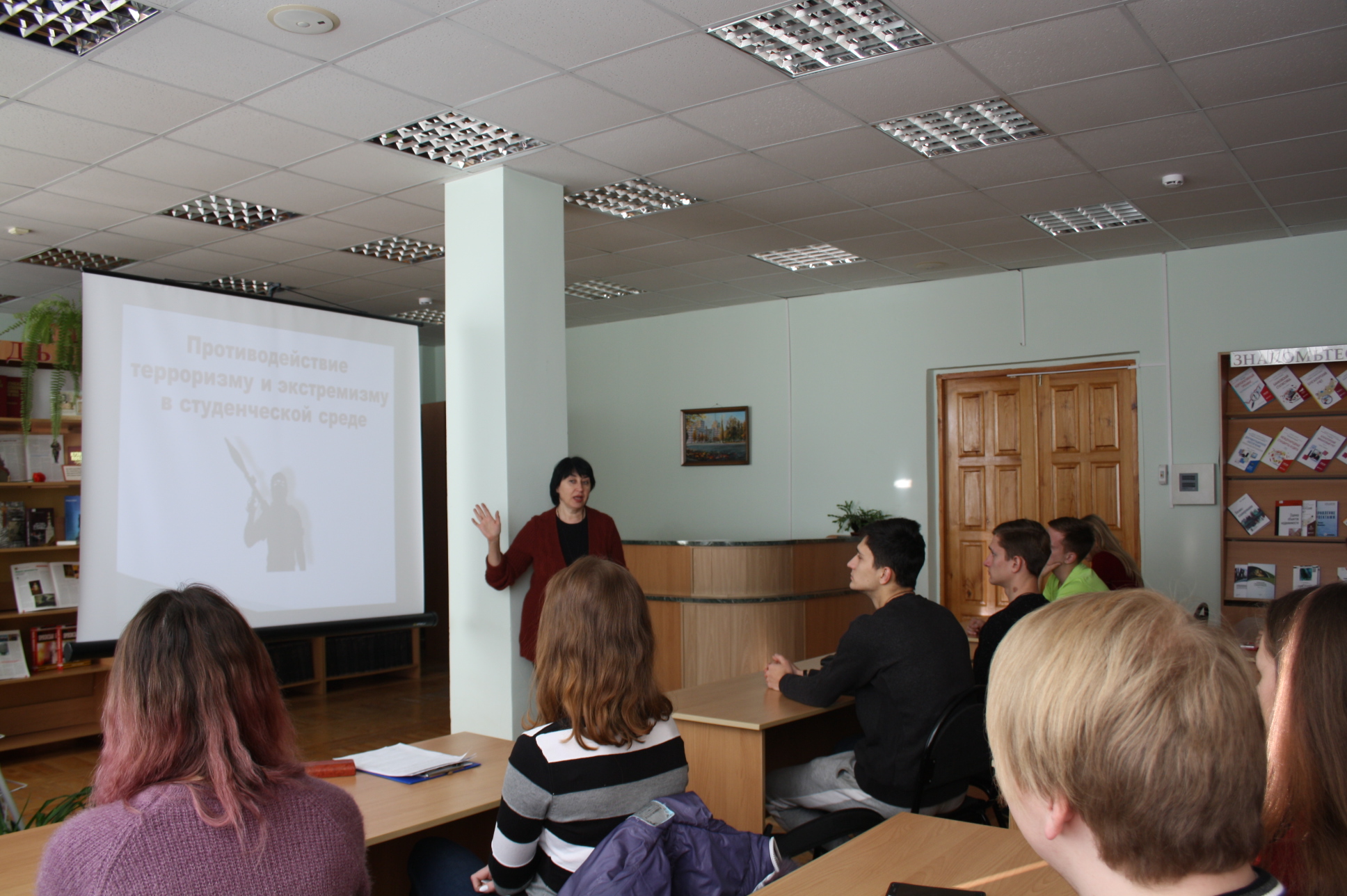 Сегодня в библиотеке состоялся актуальный разговор на тему «Противодействие терроризму и экстремизму в студенческой среде». Эта тема для обсуждения была предложена с целью содействия формированию толерантности, предупреждения межнациональной розни и нетерпимости среди молодежи.