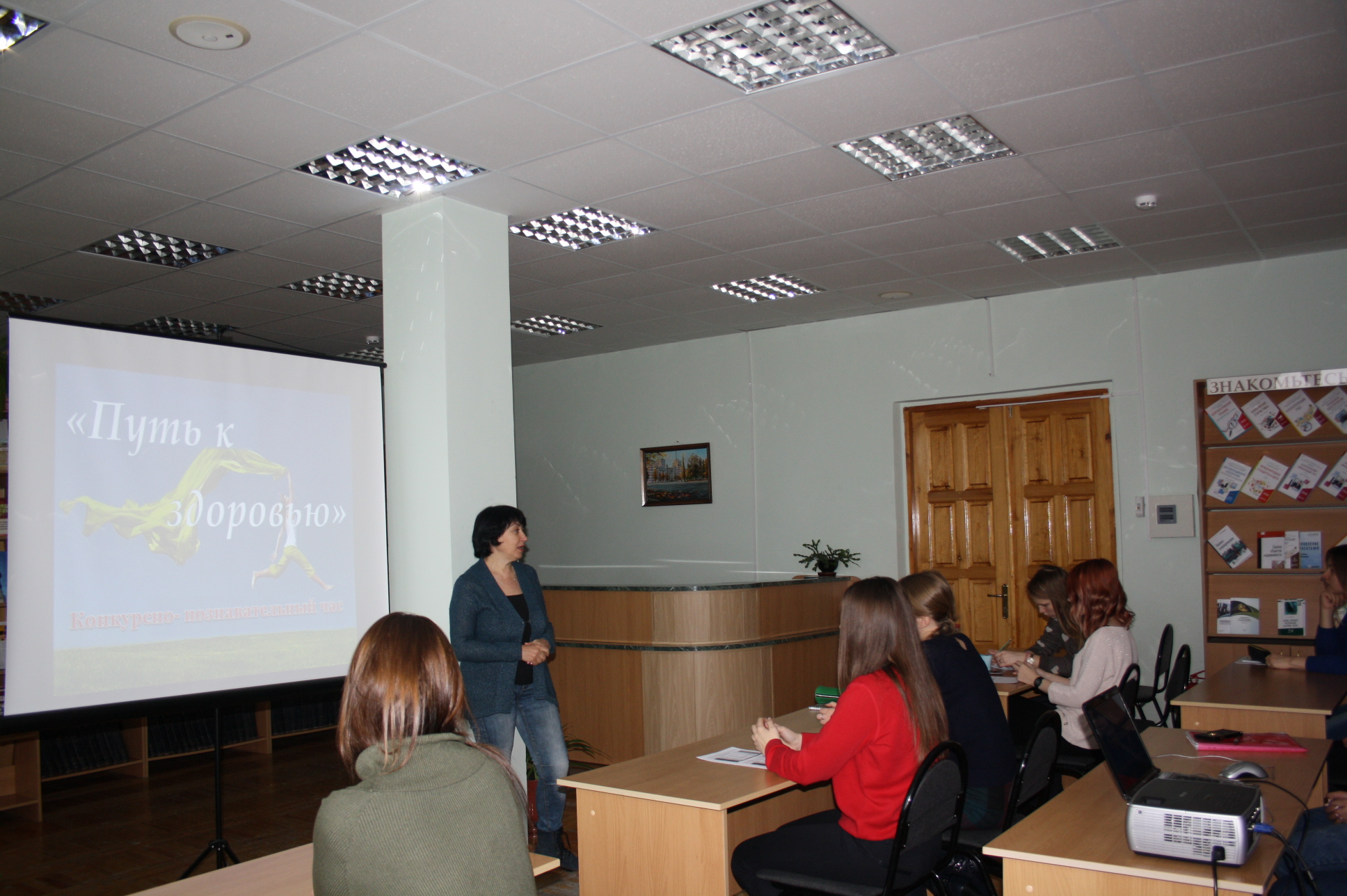 10 декабря в читальном зале гуманитарной литературы состоялся конкурсно - познавательный час «Путь к здоровью». Студенты гр. УП-11 обсудили злободневные темы, касающиеся здорового образа жизни, определили его составляющие: правильное питание, отказ от вредных привычек, соблюдение режима труда и отдыха и др. Затем приняли активное участие в конкурсах и викторинах, проявив при этом смекалку и изобретательность.