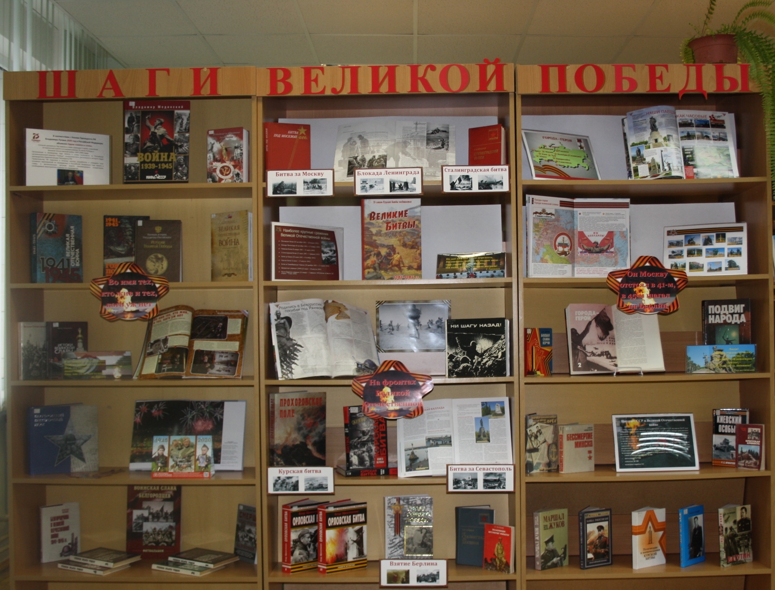 В соответствии с Указом Президента РФ Владимира Путина 2020 год в Российской Федерации объявлен Годом памяти и славы. В целях сохранения исторической памяти и в ознаменование 75-летия Победы в Великой Отечественной войне 1941-1945 г.г. сотрудники библиотеки организовали выставку - инсталляцию «Шаги Великой Победы». Война – тяжелое испытание, как физической стойкости, так и силы духа. Трудно среди бед, лишений, смертей выстоять и не потерять человеческое достоинство, не сломаться, сохранить чуткое сердце и веру в будущее, в победу. Тысячи людей прошли сквозь трудности войны, испытали ужасные мучения, но они выстояли и победили.