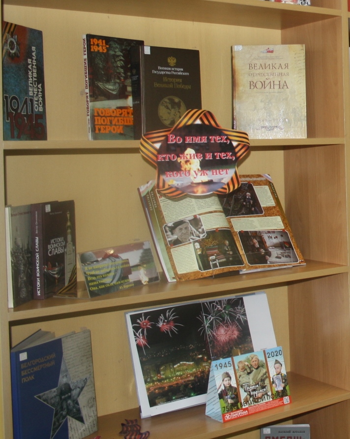 В первом разделе выставки «Во имя тех, кто жив и тех, кого уж нет» представлены книги и статьи из журналов, рассказывающие о далеких фронтовых годах, о беззаветном героизме, о подвигах, совершенных во имя Родины, о мужестве советского солдата – героя освободителя:«Белгородский бессмертный полк»; «Великая Отечественная война 1941-1945 гг.: История Великой Победы»; «Война. Народ. Победа»; В.Р. Мединский «Война 1939-1945»; В.В. Овчинников «Истоки воинской славы» и др.