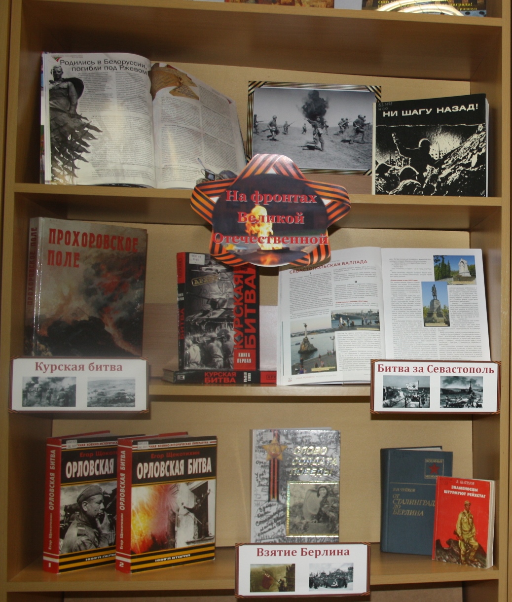 Страницы книг второго раздела «На фронтах Великой Отечественной» повествуют о крупных битвах с начала войны до великого дня Победы. Героизм и мужество советских солдат, проявленные в ходе сражений Великой Отечественной войны, заслуживают вечной памяти. Мудрость военачальников, ставшая одним из важнейших составляющих общей победы, не перестаёт удивлять и в наши дни: «Битва под Москвой»; «Великие битвы 1941-1945 гг.»; Н.И. Крылов «Сталинградский рубеж»; «Слово солдата Победы»; В.И. Чуйков «От Сталинграда до Берлина» и др.