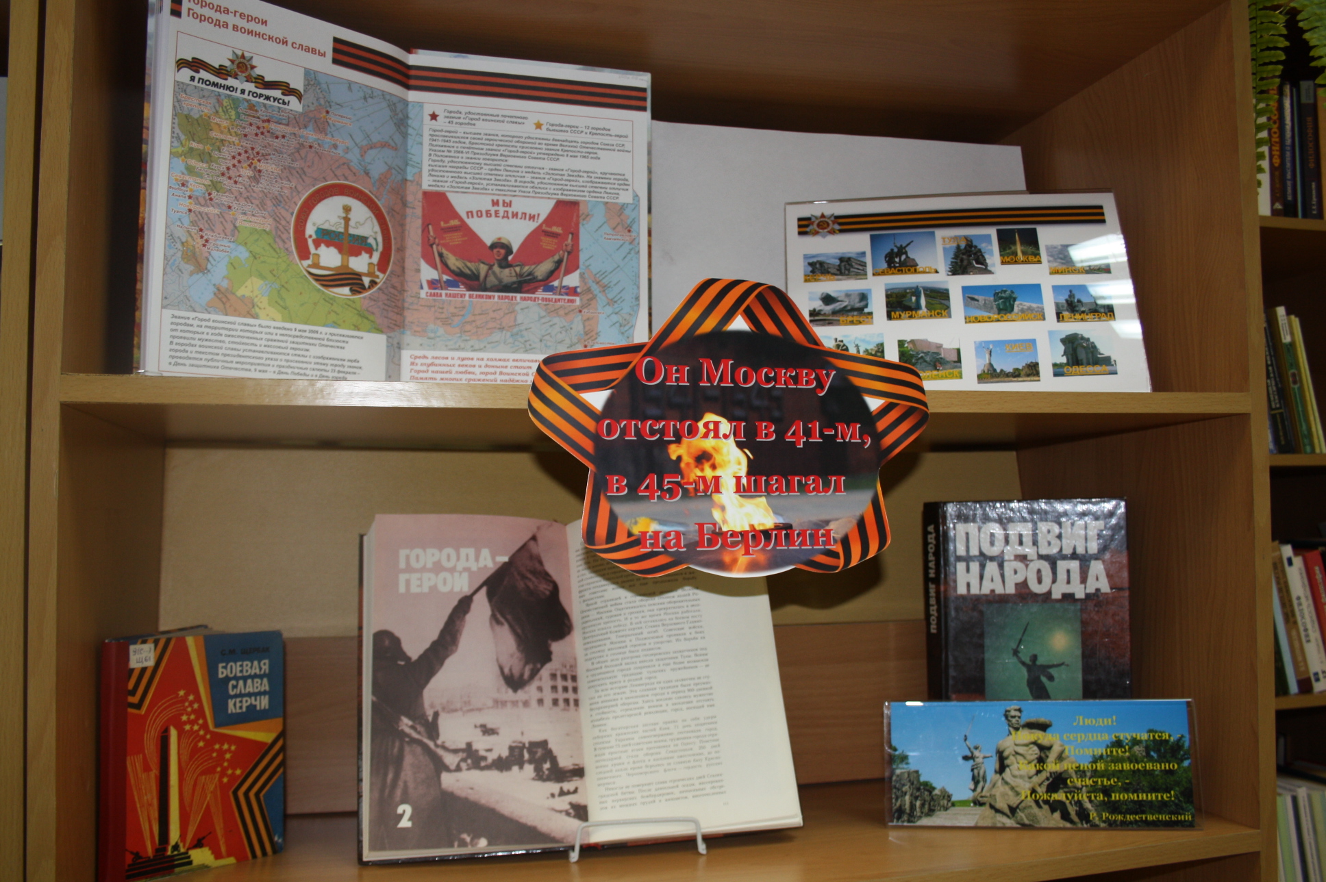 Третий раздел выставки «Он Москву отстоял в 41-м, в 45-м шагал на Берлин» посвящен городам - героям Великой Отечественной. Этого почётного звания удостоены 12 городов Советского Союза: Р.С. Иринархов «Киевский особый...»; В.К. Князюк «Брестская крепость: Историко-героическая повесть о защите и освобождении крепости в 1941-1944 гг.»; И.Г. Новиков «Бессмертие Минска»; Е.Е. Щекотихин «Моряки-тихоокеанцы в битве за Орёл»; С.М. Щербак «Боевая слава Керчи» и др.
